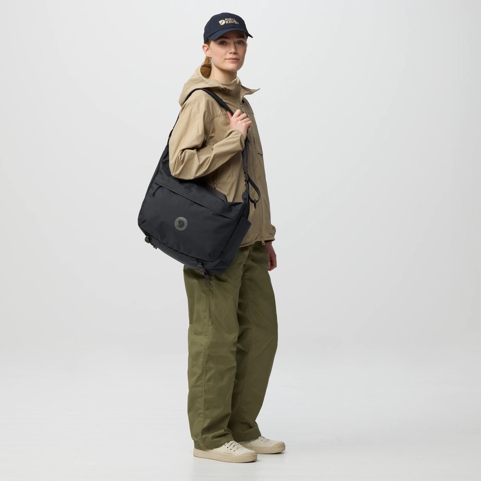 Contemporary crossbody bag designed for travelling, commuting and everyday life. Made from durable recycled polyamide with PU coating and a DWR produced without PFAS, this bag will keep your daily essentials safe and dry. The padded laptop compartment is lined with soft fleece and can fit laptops up to 15” in size. The generous front pocket has sleeves for a passport, glasses and pens and a key clip to keep your keys secure. There is a luggage sleeve on the back that can be slid over the handle of our Färden Rollers and the padded shoulder strap and handle make for easy carrying.