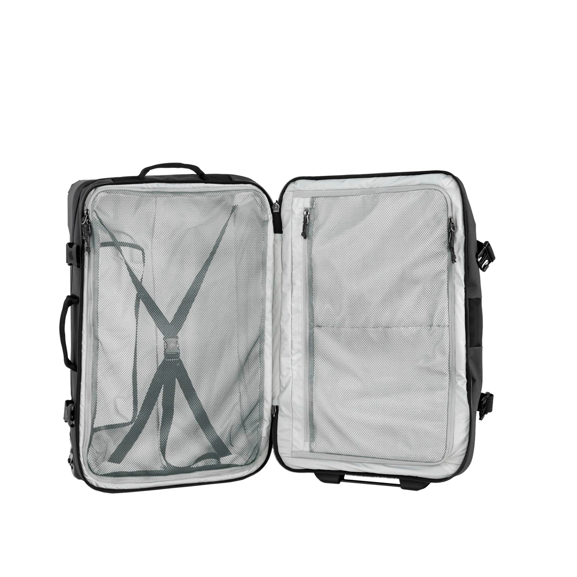 Färden Roller 75 is the perfect travelling bag for air, land or sea. Made from recycled polyamide with laminate and with a polycarbonate chassis and smooth rolling wheels that can handle bumps in the road. The front is lightly padded to protect contents. Divides in the middle, making organisation easy. External and internal compression straps and divider with mesh pocket on the inside to hold contents in place.