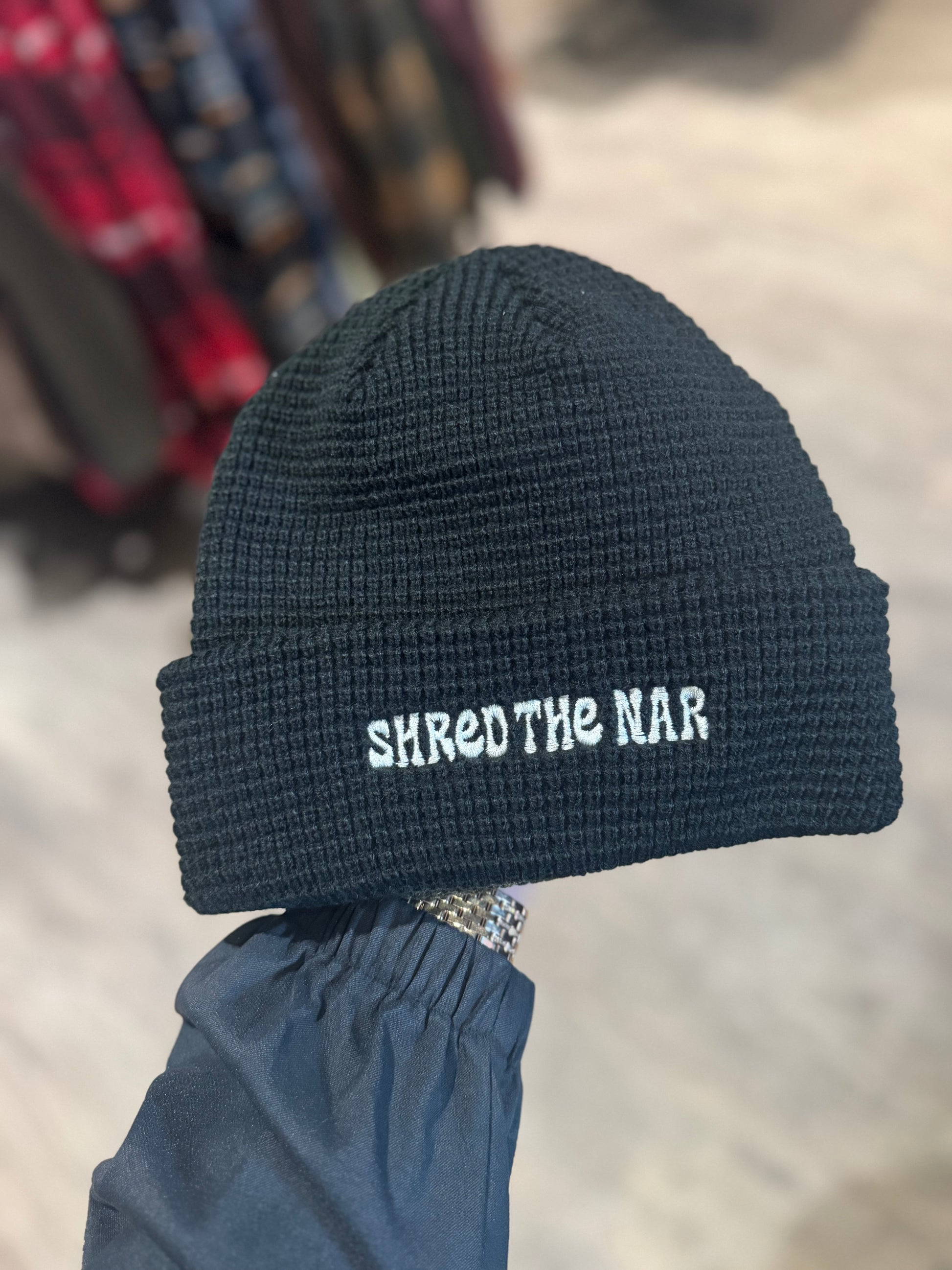 Stay warm in style with this classic Shred the Nar embroidered beanie. Crafted from soft, cozy knit fabric, it offers a snug yet comfortable fit that’s perfect for colder days. The clean embroidery adds a refined touch of detail, giving this everyday essential a polished look. Designed for versatility and warmth, this beanie is ideal for outdoor adventures, casual outings, or finishing off your cold-weather fit with effortless style.